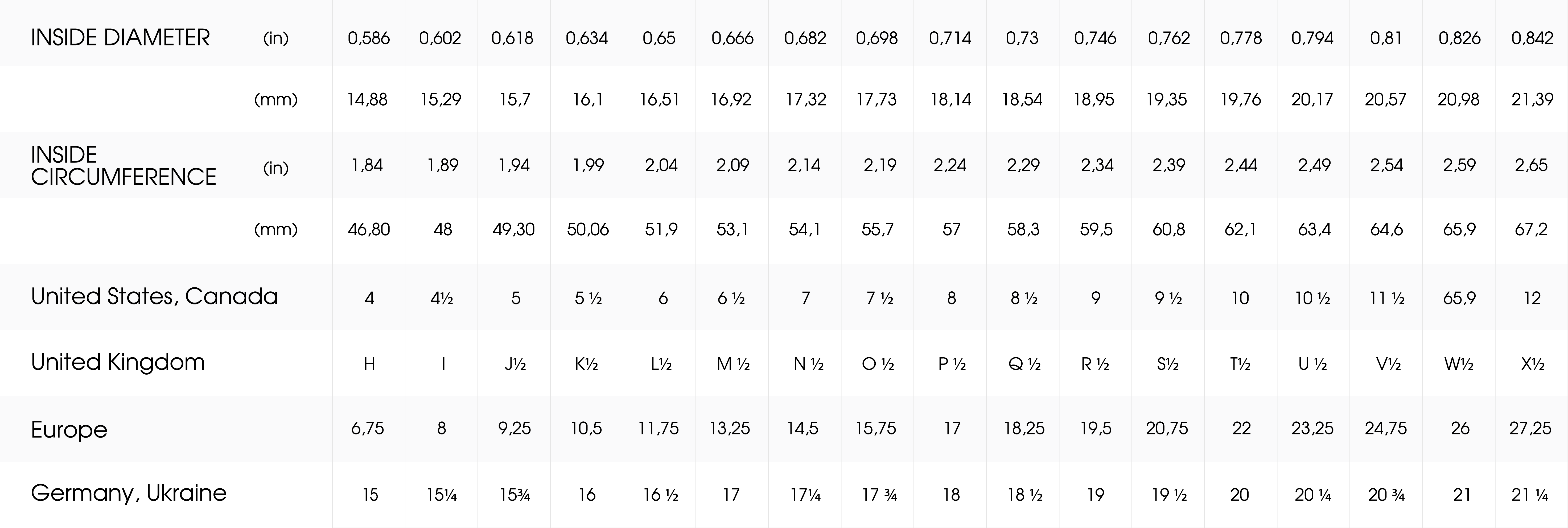 1. Select an existing ring that fits the desired finger and measure the internal diameter of the ring (in mm). Then use the below chart to determine your ring size.